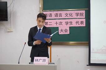 英文学院学生会轮值主席林广源向大会作第十九届学生会工作报告。报告指出,英文学院始终紧跟时代发展,积极开展党团知识竞赛等活动,增进英文学子对党、团的认同感。英文学院学生会致力于打造具有高度服务意识的优秀学生骨干团队,全心全意为同学服务。在大家的共同努力下,英文学院学生会的工作得到领导、老师和同学们的支持和肯定。