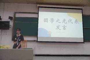 团学之光代表陈艾尔讲话。她表示,在两年多的英文团学工作中,收获不少宝贵的经验,也得到许多与朋友相处的快乐与幸福感。最后,她希望新一届的英文团学骨干能够将团学大家庭的温暖传递下去。